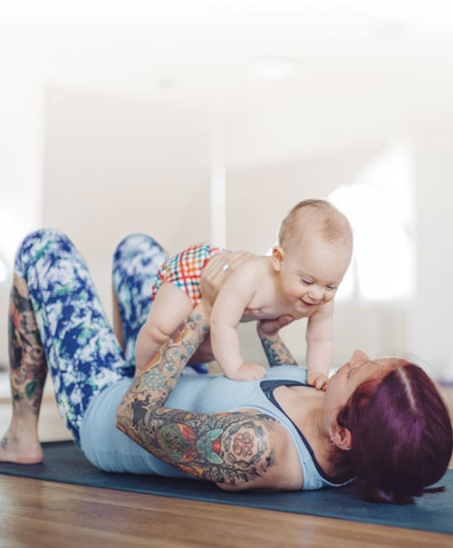 2. Coloque la mano izquierda con suavidad detrás de las orejas y el cuello del bebé, con el pulgar y el índice detrás de cada oreja y la palma entre los omóplatos del bebé. Gire el cuerpo del bebé hacia el suyo, de modo que se toquen las pancitas.